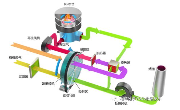 沸石轉(zhuǎn)輪濃縮+RTO運行原理:
